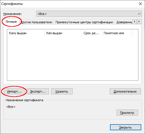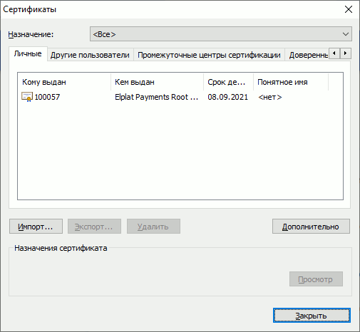 - Сертификат установлен в браузер. Нажмите кнопку "Закрыть". Если в списке более одного сертификата – удалите все старые сертификаты (смотрите на колонку "Срок действия"). Для этого выделите сертификат в списке и нажмите кнопку Удалить. После удаления сертификатов требуется перезапустить браузер.