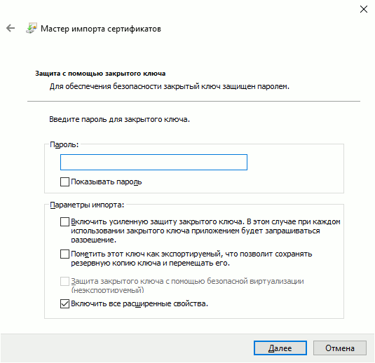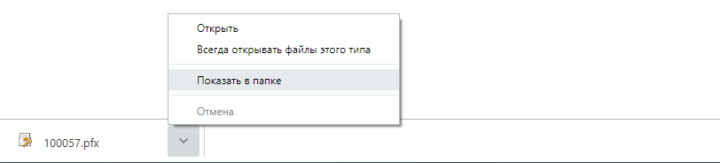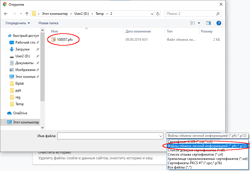 - Нажмите кнопку "Далее". Нажмите кнопку "Обзор". Выберите тип файлов "Файлы обмена личной информацией (*.pfx)" и выберите файл сохранённый на шаге 1. Нажмите кнопку "Открыть". Нажмите кнопку "Далее".